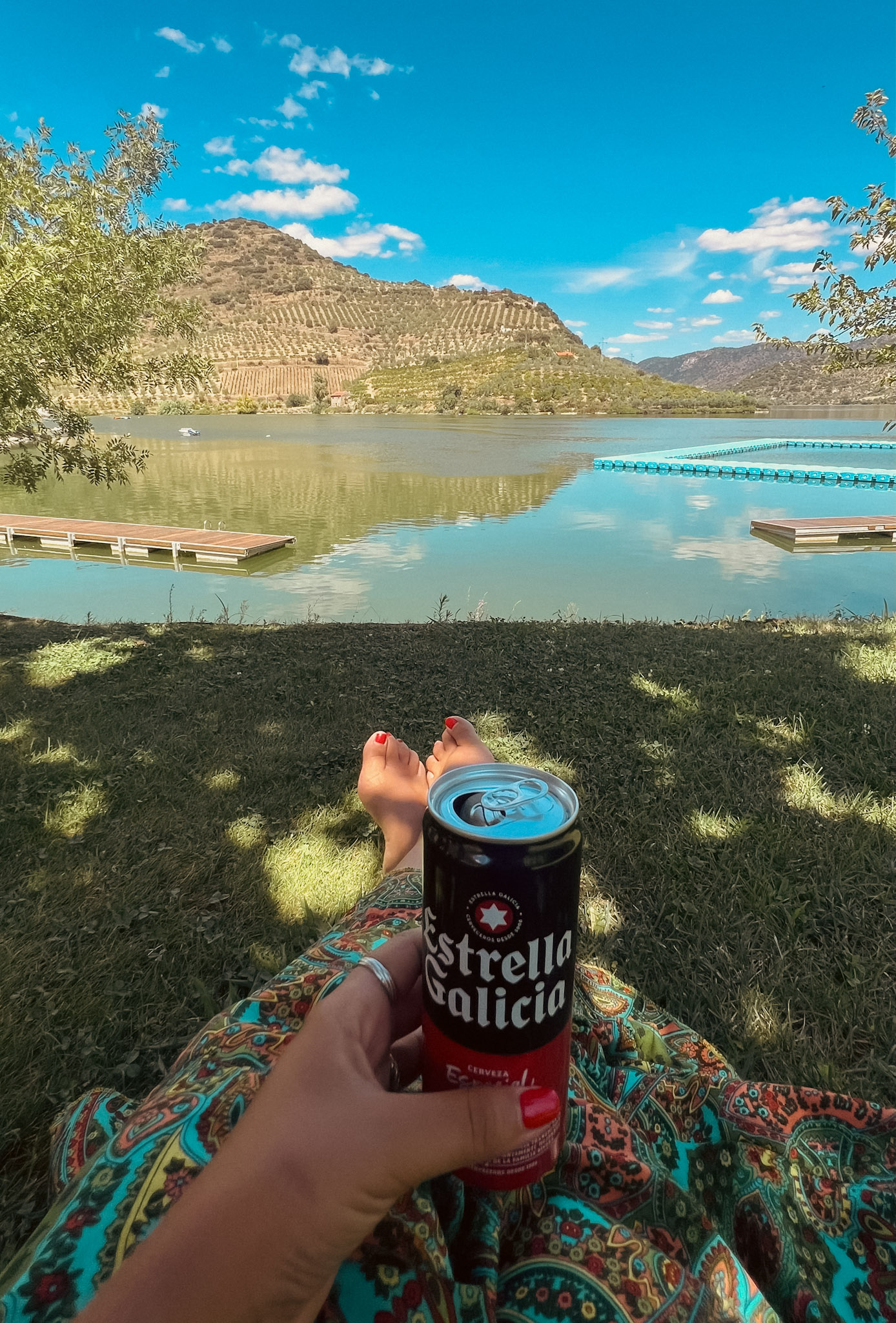 Neste tipo de viagens, para não gastarmos tanto dinheiro em refeições e evitarmos perder 2 ou 3 horas dentro de um restaurante, optamos por fazer sempre os almoços em modo piquenique. Assim sendo, vi que na Foz do Tua, entre a linha de comboio e o rio, havia um agradável parque de merendas, e foi lá que fizemos a paragem seguinte. Para nossa sorte o parque tinha um relvado muito bom, limpo e com algumas sobrinhas. Almoçamos e ainda aproveitamos para dar um mergulhinho e refrescar antes de seguir viagem.