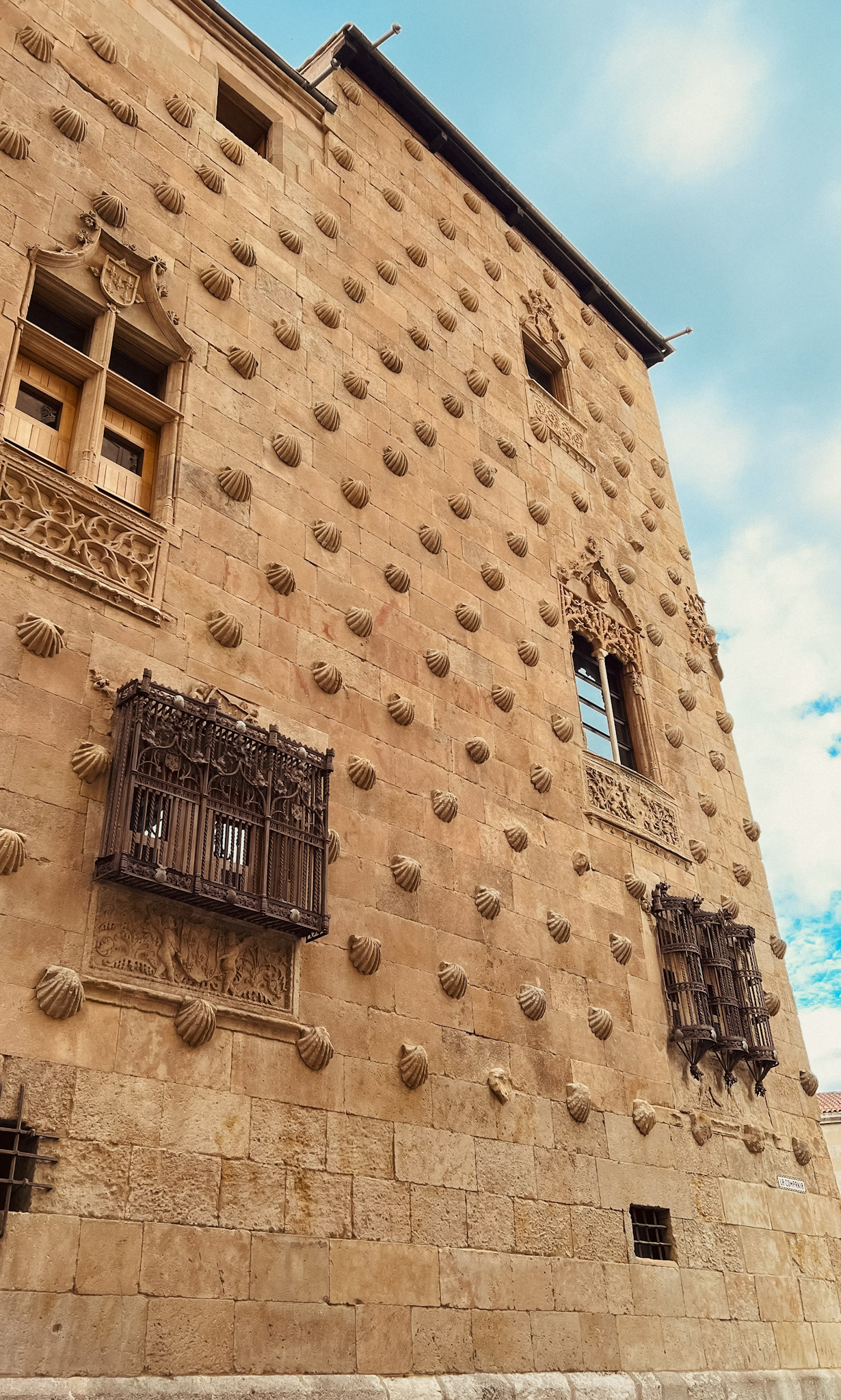 Começámos pela Casa de las Conchas. A fachada é decorada com mais de 300 conchas esculpidas na pedra, o que deu origem a várias lendas — incluindo a de que existe um tesouro escondido debaixo de uma delas.
