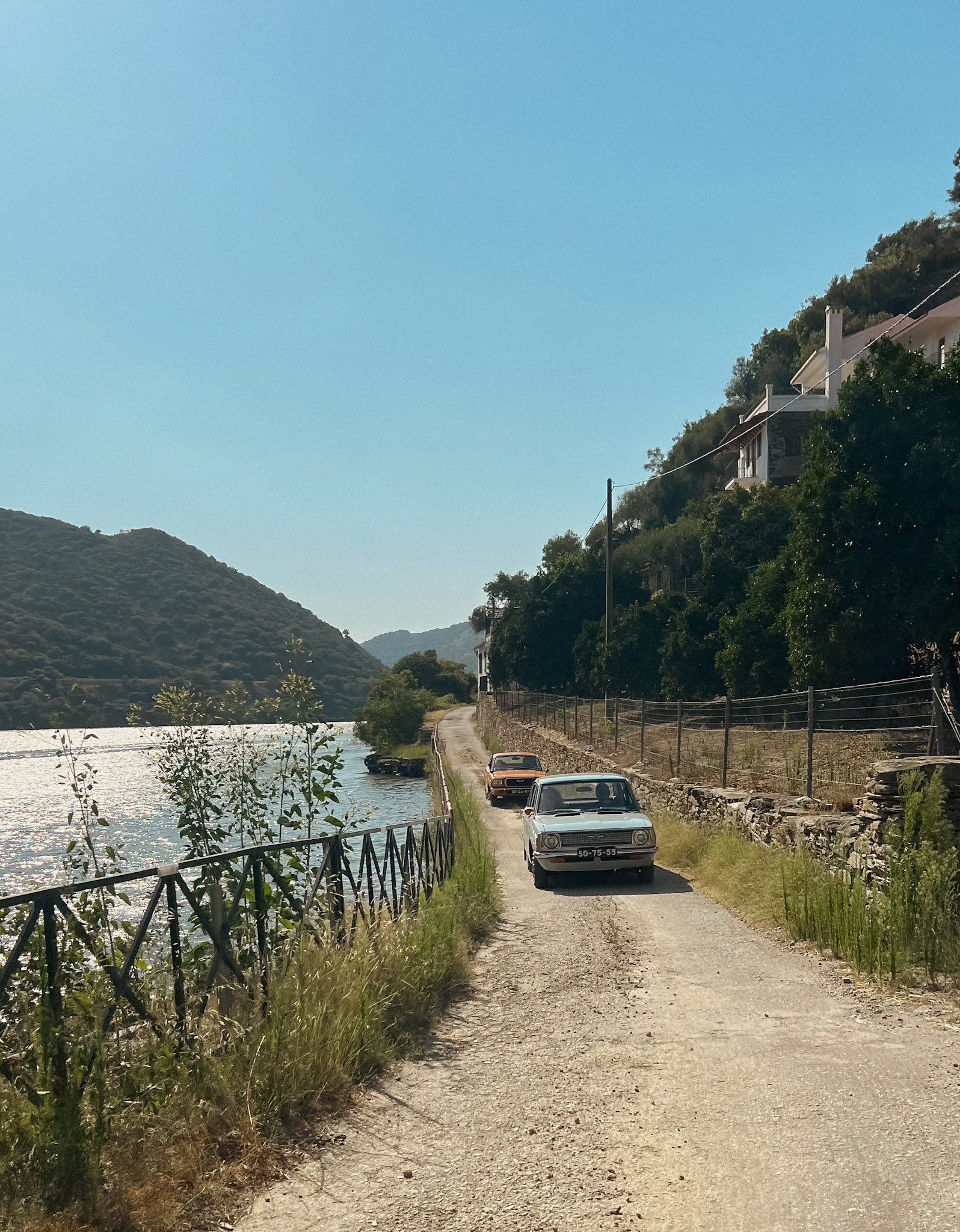 Começamos por subir a M634 até Carrazeda de Ansiães. Uma estrada com paisagens incríveis, pelo meio das vinhas, com o tipo de curvas ideiais para estes carros. A pior parte veio depois. No Google Maps tinha visto uma estradinha em Seixo de Ansiães, mesmo juntinho ao rio, que me pareceu bastante bonita. E era. O problema era o piso. Para conseguirmos fazer aquele troço, no meio de tanto buraco, terra e pedras, tivemos de ir sempre a uma velocidade muito baixa (o equivalente a ir a pé quase). E o melhor ainda estava por vir. Com mais de 40º, e nós literalmente no meio do nada e sem águas, fizemos cerca de 10 kms até à aldeia seguinte, por uma “estradita” de subida constante. Já estava tudo com a língua de fora (nós e os carros) quando conseguimos alcançar um café aberto e pedir águas a 3€ cada.